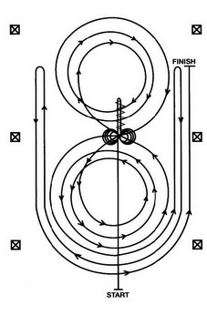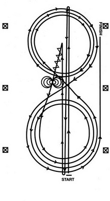 1. Começando na ponta esquerda, complete dois círculos à esquerda: o primeiro círculo grande e rápido; o segundo círculo pequeno e lento. Pare no centro da arena. Pausa.