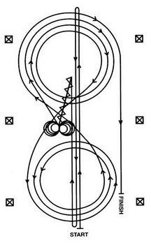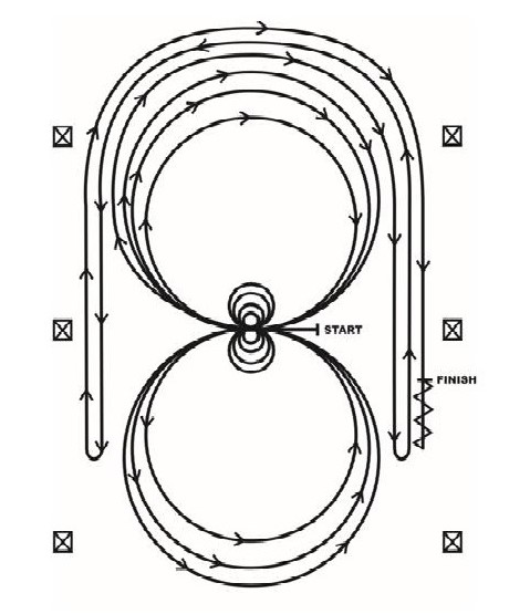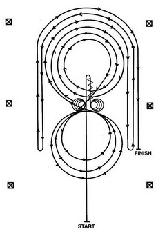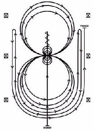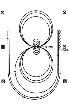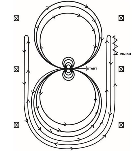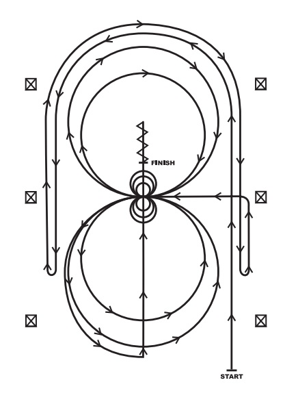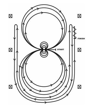 3. Começando na ponta direita, complete dois círculos para a direita: o primeiro sendo grande e rápido; o segundo círculo pequeno e lento. Pare no centro da arena. Pausa.