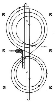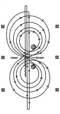 6. Inicie na mão direita, complete 3 círculos à direita: os dois primeiros grandes e rápidos e o terceiro pequeno e lento. Trocar de mão no centro da arena