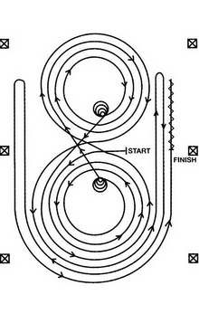 5. Complete 3 círculos para a direita. Dois grandes e rápidos e um pequeno e lento. Troque de mãos no centro da pista.